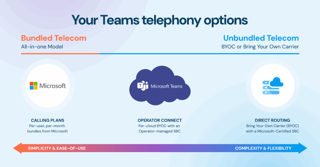 Each Teams connectivity solution varies in complexity, control, and cost. They can be evaluated as “bundled telecom,” where the phone calls are available as a preset package, or as “unbundled telecom,” where connecting to a carrier offers usage-based pricing and advanced options. Here’s a closer look to help you decide which one makes sense for your business.